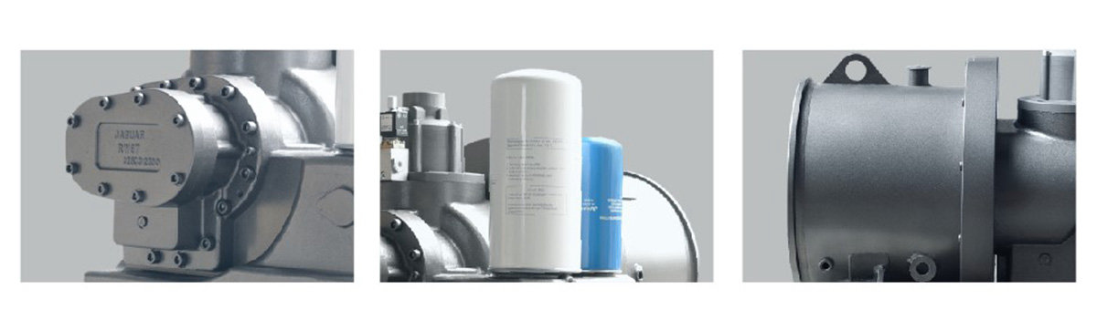 1.高精度的螺杆机头: 采用捷豹的第三代不对称螺杆转子型线以及重载轴承选型,经过反复实验的高效率螺杆机头,为用户提供超大排气量以及延长使用寿命。