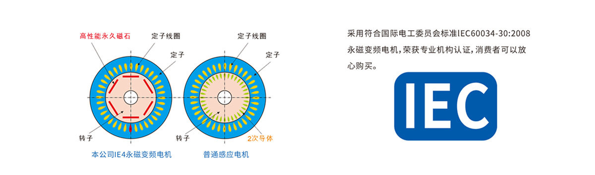IE4永磁变频电机使用稀土材料钕铁硼,其中钕铁硼 (NdFeB)是当代磁体中性能较强的永磁体,具有高剩磁、高矫顽力、高磁能积、高性能价格比等特性,而且容易加工成各种尺寸,现已广泛应用于航空、航天、电子、电声、机电、仪器、仪表及其它需永磁场的装置和设备中。永磁变频电机是由永磁体建立励磁磁场,从而实现机电能量高效转换的装置,它与电励磁同步电机一样以同步旋转,亦称永磁同步电机。永磁变频电机与电励磁同步电机相比,具有优秀的能效(高达IE4)、结构紧凑、体积小、重量轻等特点,由于永磁变频电机取消了电励磁系统,从而提高了电机效率,使得电机结构简化,运行非常可靠。
