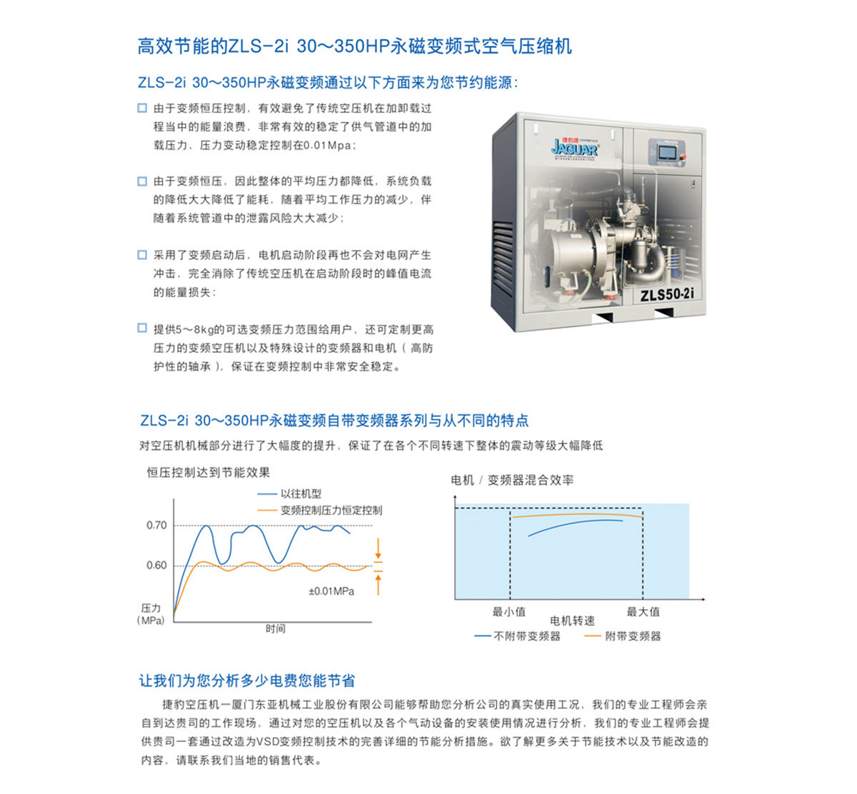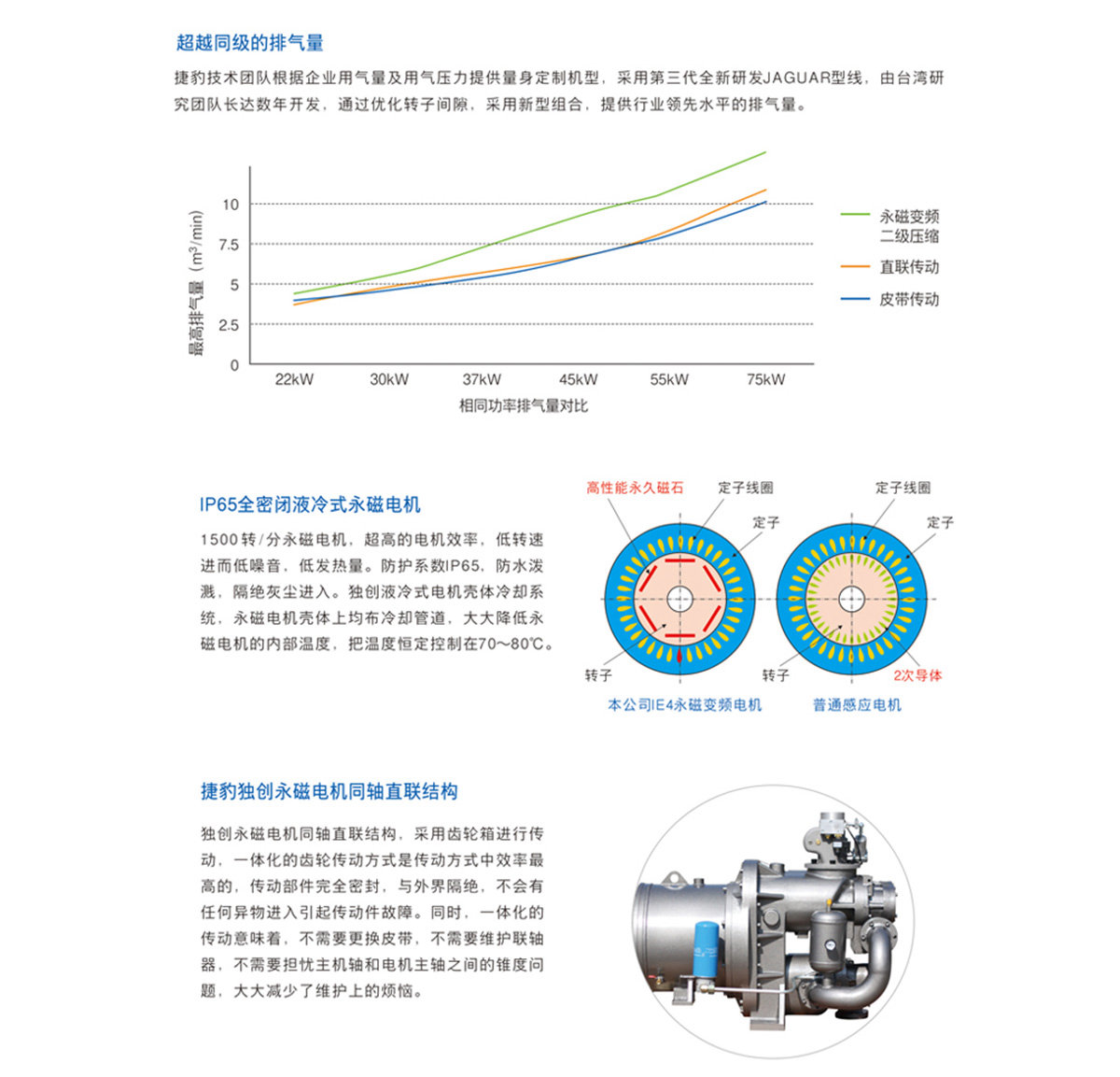 永磁变频空压机全新一代外观设计,全新结构,品质稳定 采用同轴传动方式,传动效率更高,零传动效率损耗 采用IE4永磁变频电机,根据客户需求自由变化转速 全密封液冷式电机壳体,IP65防护系数